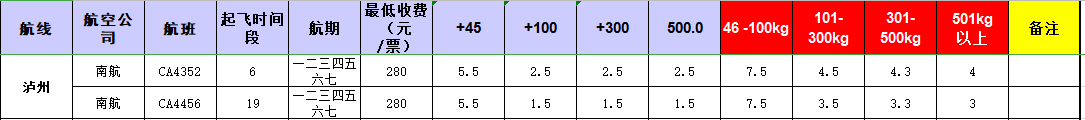 廣州白云場(chǎng)貨運(yùn)部,廣州到瀘州空運(yùn)價(jià)格表,此飛機(jī)價(jià)格托運(yùn)表僅為參考,具體請(qǐng)致電廣州白云機(jī)場(chǎng)貨運(yùn)部廣空當(dāng)日達(dá)服務(wù)電話4009218126咨詢?。商砑涌头⑿?/span>15360896756)